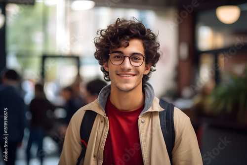 Smiling young man with curly hair and glasses wearing a beige jacket and backpack outdoors