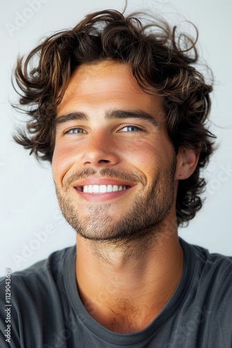 Smiling young man with curly hair poses casually against a light background showcasing his bright, cheerful demeanor during a relaxed moment