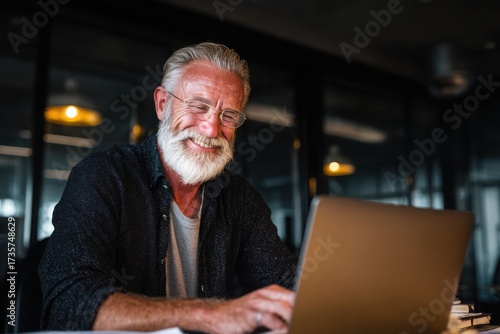 smiling young man working on a laptop in the office handsome, mature male businessman smiling while using his computer at his work desk.
