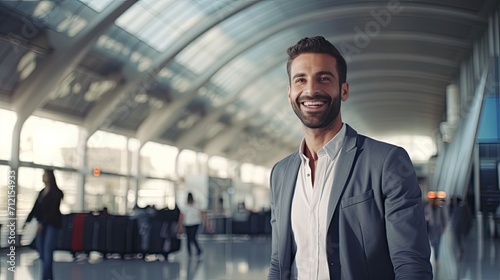 smiling young Middle Eastern man with a digital tablet, waiting at the airport terminal.