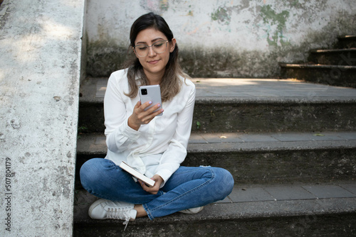smiling young millennial girl sitting on the park steps checking her phone and holding a book.
