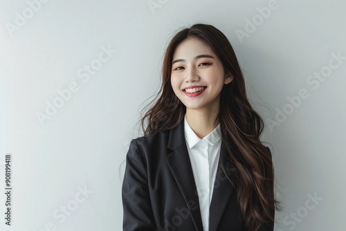 Smiling Young Professional Korean Woman with Long Hair in Business Attire Against White Background, Portrait Shot