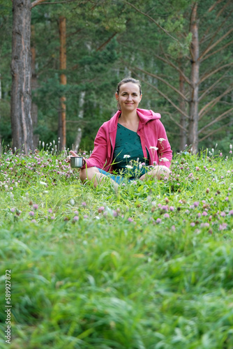 Smiling Young Woman Sitting on the Glade by the Pine Forest, Holding a Thermos Mug in Hands. Ecology and Harmony with Nature Concept