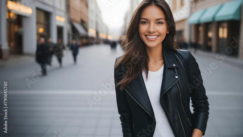 Smiling young woman stylishly dressed in a black leather jacket on a bustling city street, denoting urban lifestyle and casual fashion