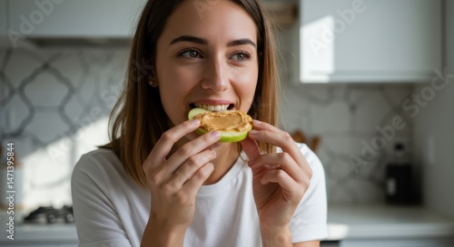 Smiling young woman taking a bite of a green sandwich in a bright modern kitchen