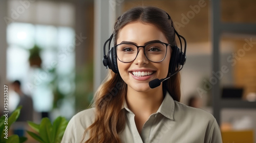 Smiling Young Woman Telemarketing in Contact Us Center with Headset and Sales Tools