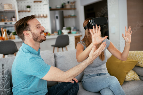 Smiling young woman using VR headset at home on couch. Woman and her husband enjoying virtual reality in apartment.