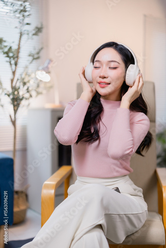 Smiling young woman wearing headphones, enjoying music in a cozy indoor setting. She is seated comfortably in a modern living room, surrounded by soft lighting and plants