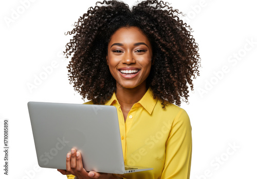 Smiling young woman with afro hairstyle holding a laptop computer and looking directly forward transparent background