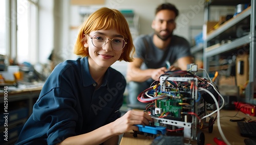 Smiling young woman with glasses assembling an intricate robot with exposed circuitry in a brightly lit workshop.