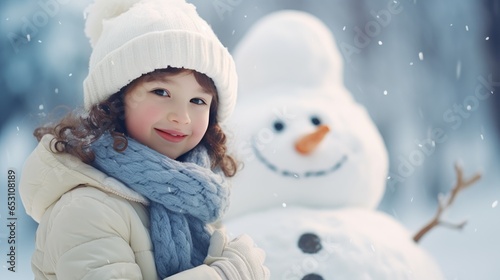 Smiling young woman with snowman on white Christmas in winter snow