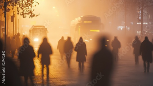 Smog-filled street illuminated by streetlights, pedestrians blurred in motion, capturing the essence of urban air pollution.
