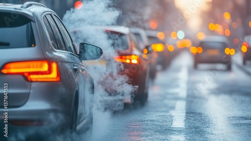 Smoke and vapor from car exhausts in traffic contribute to city air pollution, highlighting urban environmental issues.