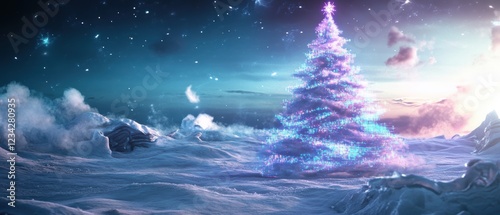 Smoke Christmas tree Concept. A vibrant, glowing Christmas tree stands in a snowy landscape under a starry sky, evoking a magical winter scene.