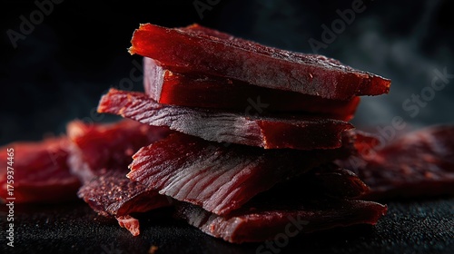 Smoked beef jerky pieces on dark background, moody macro lighting, texture focus