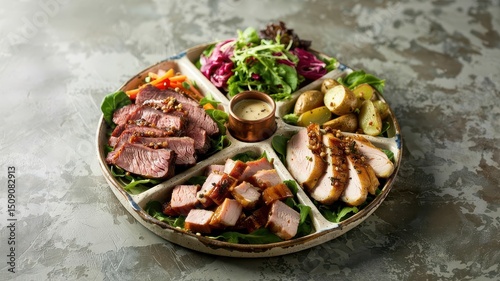 Smoked meat salad with beef brisket, pork belly and chicken on compartmentalized ceramic platter with fresh greens and roasted potatoes