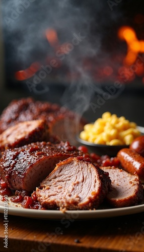Smoked pulled pork with barbecue sauce and sides on a rustic plate, steaming in a cozy atmosphere, food concept
