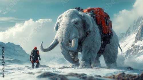 Smooth black robot with glossy red helmet and gloves with a prehistoric white mammoth with giant tusks, traversing a snowy mountain landscape.