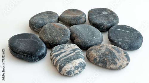 Smooth black spa stones neatly arranged along a bare back, evoking calm balance, relaxation, and natural warmth in a serene, softly lit wellness atmosphere.