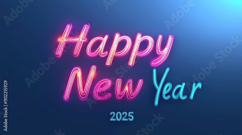Smooth gradient "Happy New Year" and "2025" text transitioning from neon pink to electric blue . Energetic and modern, ideal for festive backgrounds.