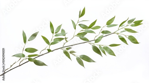 Smooth green bamboo branch with minimal leaves, isolated on white background