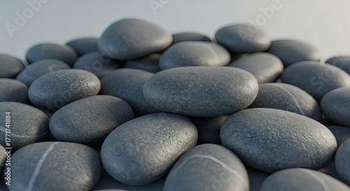 Smooth grey river stones piled gracefully creating a serene natural texture perfect for wellness and spa themes