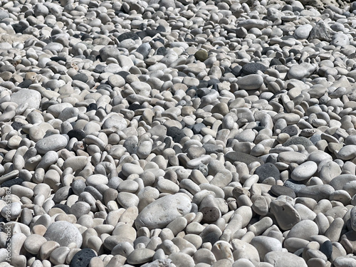Smooth Pebbles Resting on a Beautiful Sunlit Beach Shore Under a Clear Sky