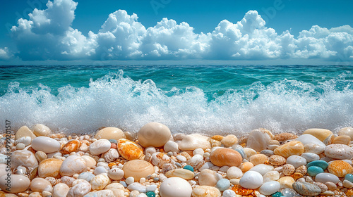 Smooth pebbles scattered on a serene beach, where crisp waves gently crash onto the shore. The contrast between the solid stones and the fluid water represents balance, endurance, and the passage of t
