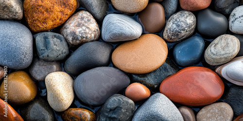 Smooth river stones in various colors and textures create calming natural background, perfect for relaxation and meditation. arrangement showcases earthy tones and unique patterns