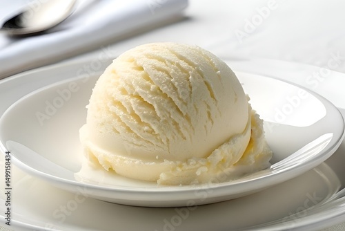 Smooth Vanilla Ice Cream Scoop on White Plate with Minimalist Background