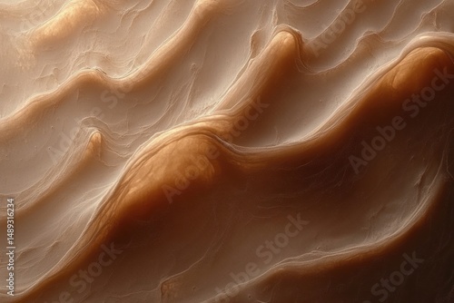 Smooth, wavy sand dunes bathed in warm light highlighting their flowing textures and gentle curves in a desert landscape