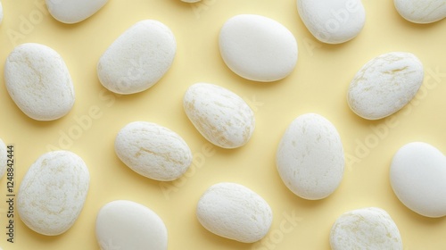Smooth white stones arranged artfully on a pastel yellow background