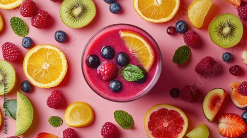 Smoothie with mixed berries in a glass, surrounded by colorful fruit slices