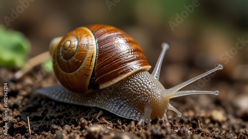 Snail crawling on forest floor, nature background, wildlife photography, educational use