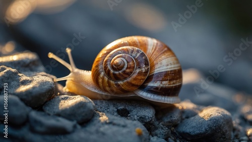 Snail Crawling on Rocks with Striped Shell in Soft Lighting