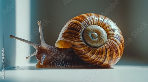 Snail crawling on windowsill, sunlight beam, indoor macro