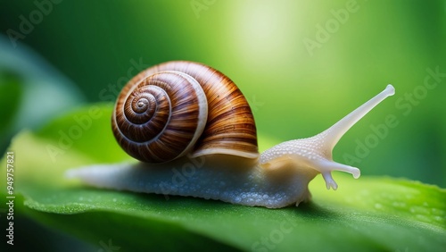 Snail on a Leaf, detailed view of a snail slowly moving across a leaf