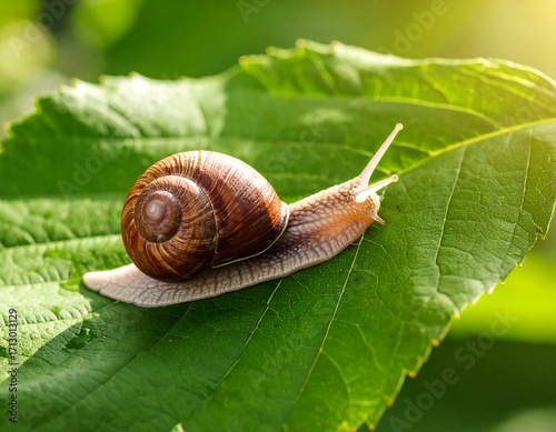 Snail on a vibrant green leaf in sunlight