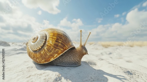 Snail on sandy beach under blue sky with white clouds and bright sunlight