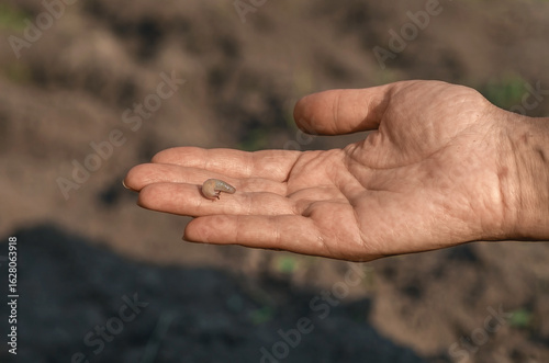 Snail sits on woman's palm and slowly crawls over skin. Benefits of snails in cosmetology.