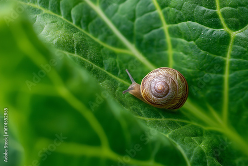 Snail slowly climbing a veined green leaf illuminated by soft diffused natural light in calm macro setting