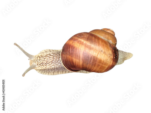Snail with horns and brown spiral shell looking forward top flat view isolated on white