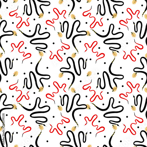 Snakes exotic pattern seamless with red and black reptiles on white background. Hand drawn illustration minimalistic style