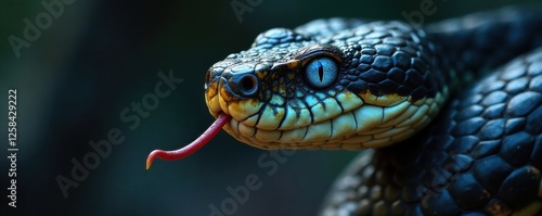 Snake's head close-up with piercing blue eyes and forked tongue exposed , wildlife, head