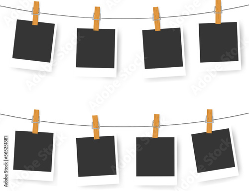 Snapshots attached to a clothespin. Realisctic retro photo frames. Booth empty teplate for collage
