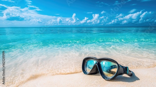 Snorkel Equipment on Sandy Beach with Clear Blue Ocean View