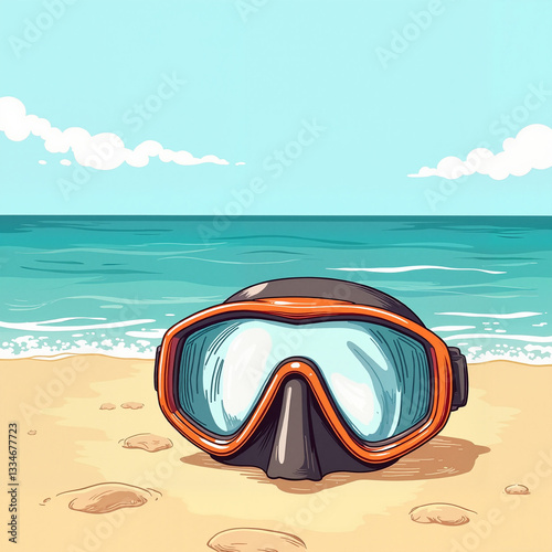 Snorkeling gear resting on sandy beach against ocean backdrop