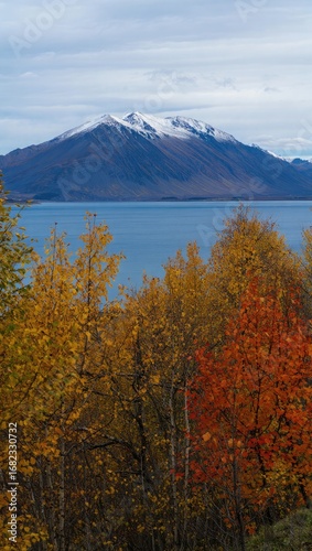 Snow- Capped Mountain Overlooking Autumn Trees and Lake