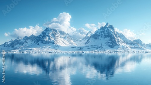 Snow capped mountains reflected in water under a cloudy, clear blue sky