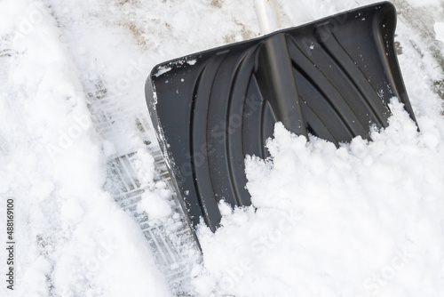 Snow cleaning with a large shovel in winter
